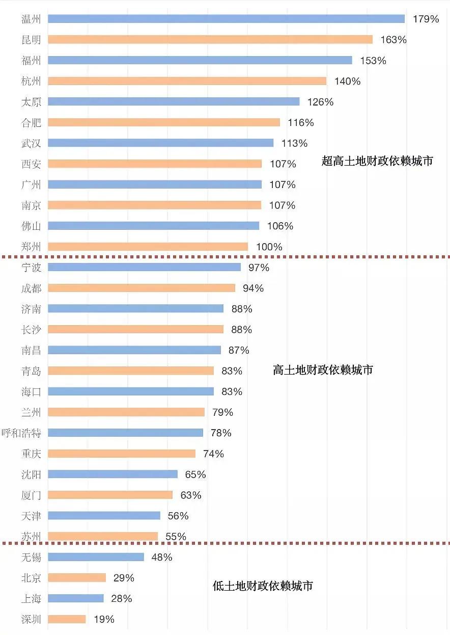 2019年,各地政府对土地财政的依赖度极高,22个城市的土地依赖度超过70%。其中,温州、福州、杭州、广州、昆明、南京、合肥等城市的土地依赖度更是超过100%。